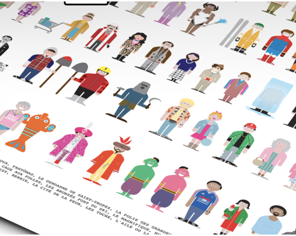 Ode aux grands classiques du cinéma comique, des grands nanards aux chefs d'œuvre. Richement illustrée, cette affiche retrace les incontournables costumes qui ont marqués la comédie française, depuis "Mon oncle" de Tati à "Bienvenue chez les Ch'tis" ou encore "Les Valseuses". La Majorette rend hommage aux célèbres acteurs en humour et vous remémore de sacrés fous rires : la danse yiddish de Louis de Funès dans Rabbi Jacob, la chanson de Jean-Claude Duss dans Les Bronzés font du ski... Un indispensable à voir et à revoir et à accrocher chez soi !