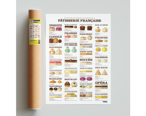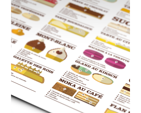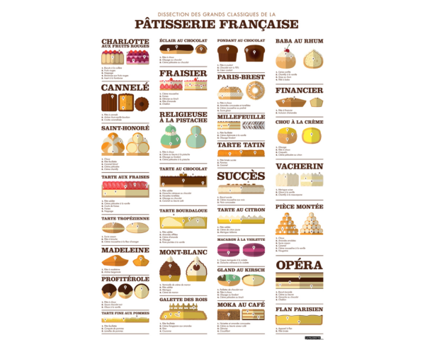 Graphique et gourmande, cette affiche est une dissection de 31 grands classiques de la pâtisserie : Baba au rhum, Fraisier, Tarte Tatin... Agitatrice de papilles, La Majorette régalera, en images, vos petits becs sucrés.