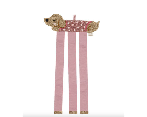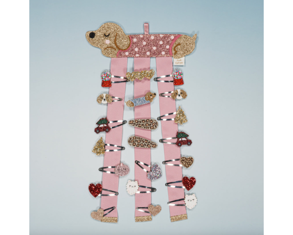 Découvrez ce porte barrettes mural en forme de teckel allongé aussi rigolo qu’adorable ! Avec son look à pois et sa frimousse pailletée, il garde précieusement vos accessoires préférés. Une déco à croquer pour les amoureux des chiens et des accessoires bien rangés !