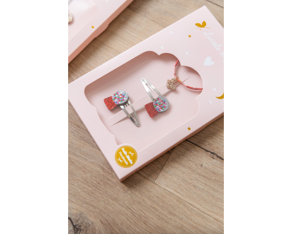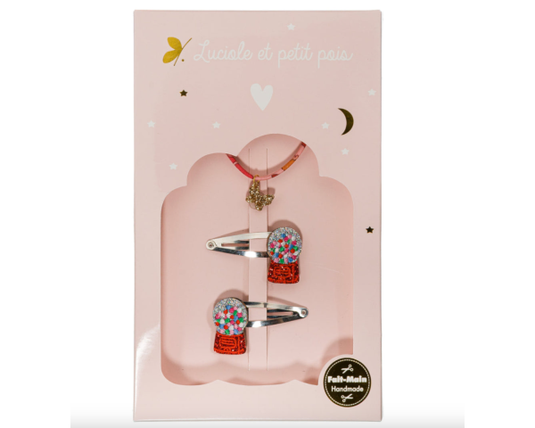Un coffret plein de peps pour les fans de looks gourmands ! Il comprend deux barrettes bubble gum et un bracelet liberty orné d'une perle pailletée, la dose parfaite de couleurs acidulées à porter tous les jours.
