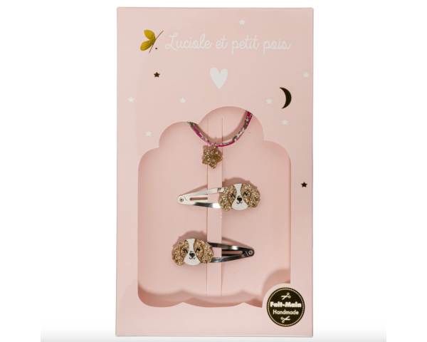 Un coffret à croquer avec deux barrettes Cavalier King Charles et un bracelet liberty orné d'une étoile dorée.