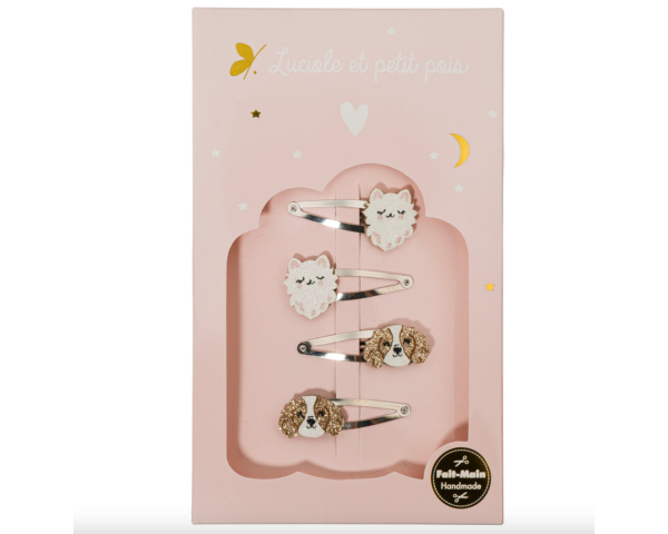 Team chat ou team chien ? Plus besoin de choisir avec ce coffret de barrettes glitter pour un look plein de tendresse !