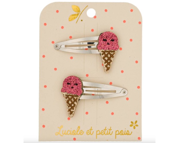 Le petit plaisir acidulé à glisser dans les cheveux ! Ces glaces framboise glitter sont le détail qui apporte gaieté et gourmandise à toutes les coiffures. Ces barrettes sont montées sur des clic clac de 5 cm pour une bonne tenue dans les cheveux fins comme plus épais.