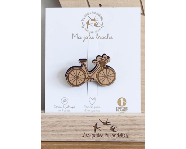 Cette broche vélo en bois sera parfaite pour les amoureux de la liberté et de la poésie, avec son petit panier fleuri!
