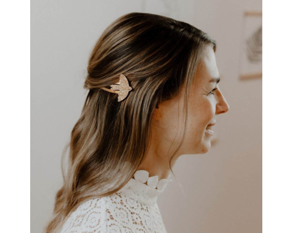 Une chouette barrette avec sa petite colombe pailletée. Cette grande barrette simple à paillettes dorées de 7cm.
