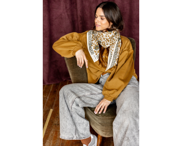 - En raison du procédé de teinture naturelle utilisé, le foulard peut déteindre par frottements sur d'autres matières. Nous vous recommandons de le laver à la main seul avant de le porter pour la première fois