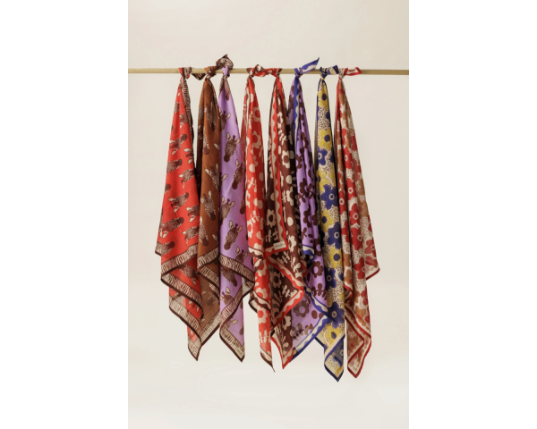 En raison du procédé de teinture naturelle utilisé, les foulards peuvent déteindre par frottements sur d'autres matières. Nous vous recommandons de les laver à 30° programme délicat seuls ou avec des coloris similaires avant de les porter pour la première fois.