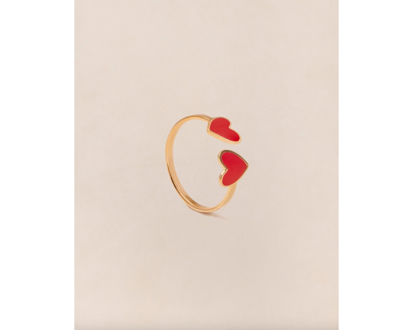 Bague ajustable 2 coeurs Billie en laiton doré à l'or fin et émail rouge.