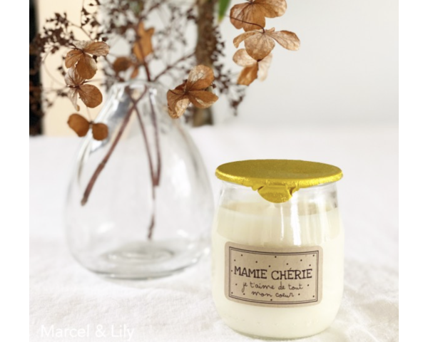 La bougie "P'tit pot de yaourt" "Ma petite mamie chérie" MARCEL & LILY, qui sent si bon le caramel au beurre salé, est fabriquée en France par un artisan cirier dans les règles de l'art.