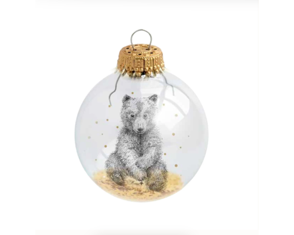 Dessin sérigraphié en noir et doré en jouant sur la transparence, retrouvez : l'ourson, l'hérisson, les lapins et la pomme de pin.