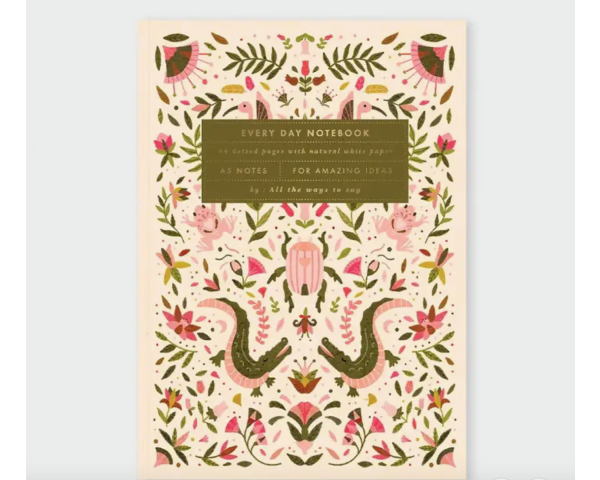 Carnet A5 par All The Ways To Say. Cette couverture époustouflante présente un jardin symétrique et complexe habité par des crocodiles rougissants, des grenouilles espiègles et des scarabées dorés. Rehaussé d'accents en feuille d'or scintillante, il transforme chaque session d'écriture en un rituel sophistiqué pour vos "idées incroyables." Le sanctuaire parfait pour une imagination sauvage.