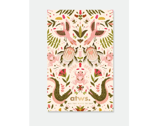 Cet ensemble charmant se compose de deux scarabées roses symétriques, chacun orné d'un délicat petit cœur sur le dos et d'une finition en émail doré éclatant. Présenté sur une superbe carte illustrée aux motifs botaniques peuplés d'oiseaux roses, de grenouilles et de crocodiles, ce duo est idéal pour ajouter une touche d'élégance symétrique à vos revers, sacs ou cols.