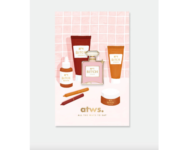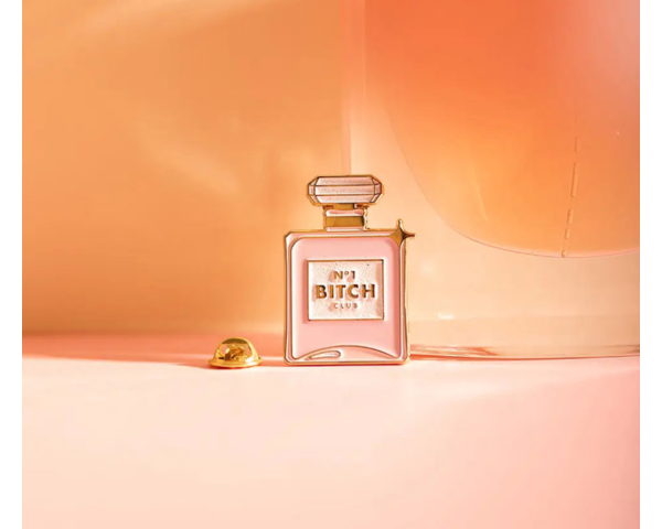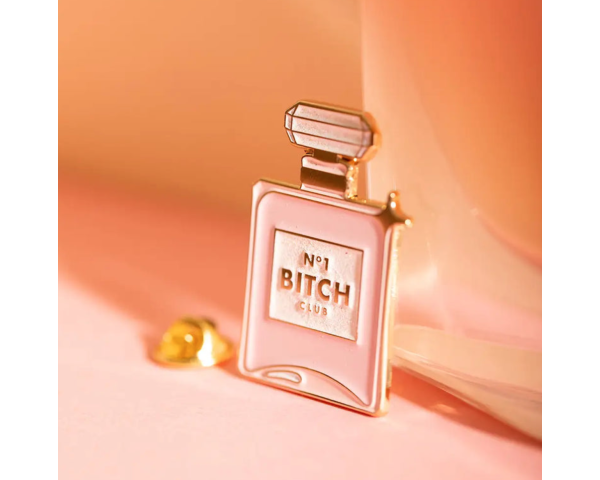 Inspiré des flacons de parfum iconiques, cet accessoire chic arbore une bouteille rose marquée "N°1 BITCH CLUB", sublimée par une finition en émail doré éclatant. Présenté sur une carte illustrée évoquant une coiffeuse remplie de produits de beauté, ce pin's apporte une touche d'impertinence élégante à votre veste, votre sac ou votre chapeau préféré.