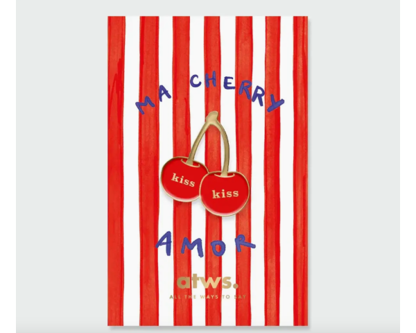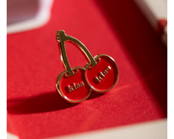 Épingle Émaillée par All The Ways To Say. Cet adorable accessoire présente deux cerises rouges vibrantes suspendues à une tige dorée, chacune gravée de manière ludique avec le mot "kiss". Confectionné avec une finition émaillée dorée de qualité supérieure, il ajoute une touche de "Ma Cherry Amor" à n'importe quelle veste, chapeau ou sac.