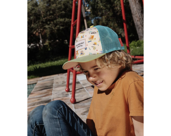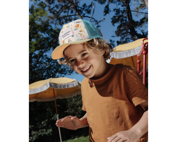 Découvrez la Casquette pour enfants et bébés, Miami Beach. Style trucker premium, motif solaire, visière courbée.