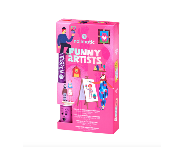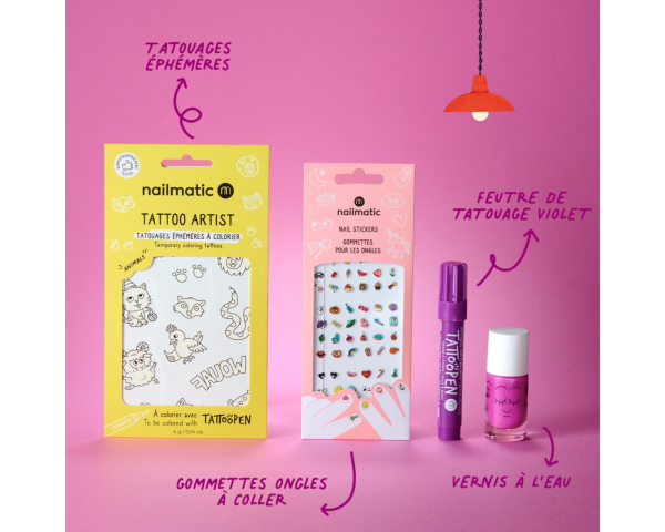 Coffret créatif : feutre Tattoopen, tatouages animals, gommettes pour les ongles et vernis à l’eau violet néon