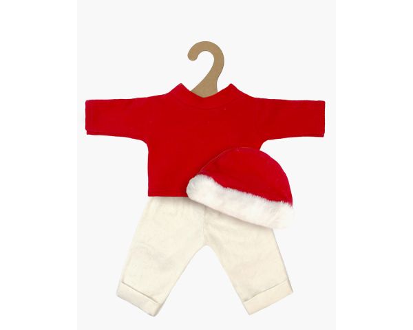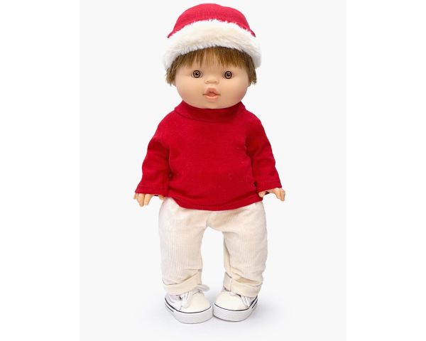 Ensemble Christmas avec pantalon en milleraie écru, sous-pull et bonnet en jersey rouge.
