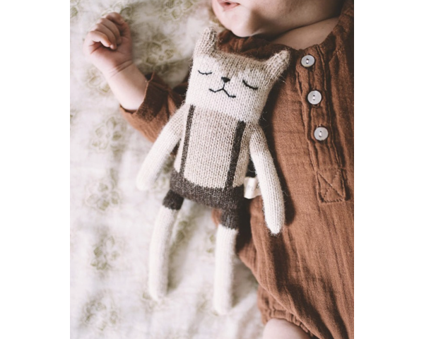 Ce doudou lapin est entièrement tricoté à la main dans un atelier équitable en Bolivie. Sa confection minutieuse participe à préserver des savoir-faire et des techniques respectueuses des humains et de la nature. Il est réalisé en pure laine baby alpaga, une matière antibactérienne très douce, particulièrement adaptée aux peaux sensibles.