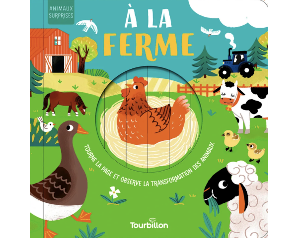 Une journée à la ferme avec les poules, la vache, le cochon… Tourne les pages et regarde les animaux se transformer !
