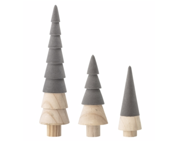 Lot de 3 sapins en bois (famille des Théacées) peints en gris.