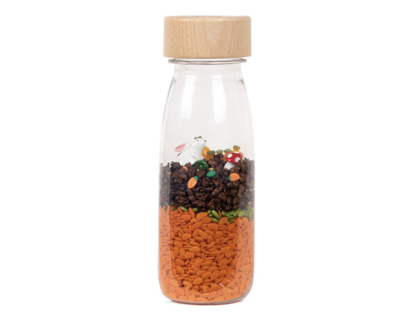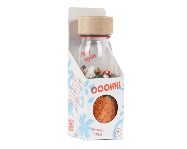 Une bouteille à secouer qui va stimuler le sens auditif de votre enfant, qui va aussi explorer chaque détail et se détendre en observant le contenu du flacon. Votre enfant va pouvoir observer, agiter et découvrir le doux son des éléments. Une invitation à explorer, à éveiller les sens et la curiosité des plus petits.