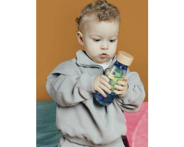 Ce jouet d'éveil est une bouteille sécurisée contenant des différents matériaux colorés qui produiront une stimulation auditive et visuelle. Lorsqu'on l'agite, tout se met à bouger à rythmes différents, à briller, c'est magique et envoûtant. Même les adultes aiment plonger leur regard dans ce tourbillon visuel.