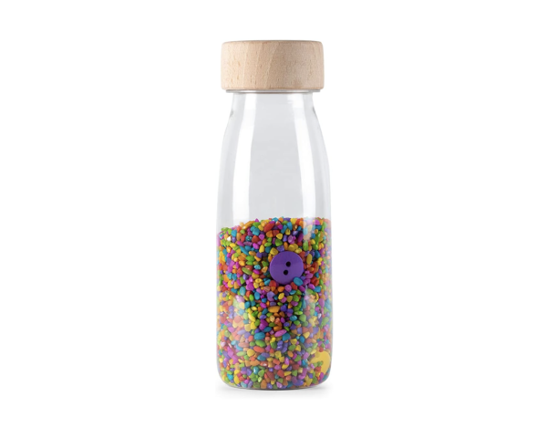 Une bouteille à secouer qui va stimuler le sens auditif de votre enfant, qui va aussi explorer chaque détail et se détendre en observant le contenu du flacon. Votre enfant va pouvoir observer, agiter et découvrir le doux son des éléments. Une invitation à explorer, à éveiller les sens et la curiosité des plus petits.