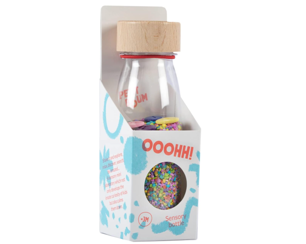 Découvrez la bouteille sensorielle Sound Boutons de la marque Petit Boum. Un jouet d’éveil coloré, inspiré de la pédagogie Montessori, qui stimule les sens des bébés dès 3 mois.