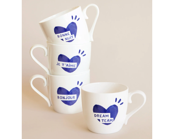 Les mugs en porcelaine Emoi Emoi infusent l’amour, dès le réveil et jusqu’au bout de la nuit. Des mots doux comme une tartine de miel, des motifs créés à la main dans notre studio parisien.
