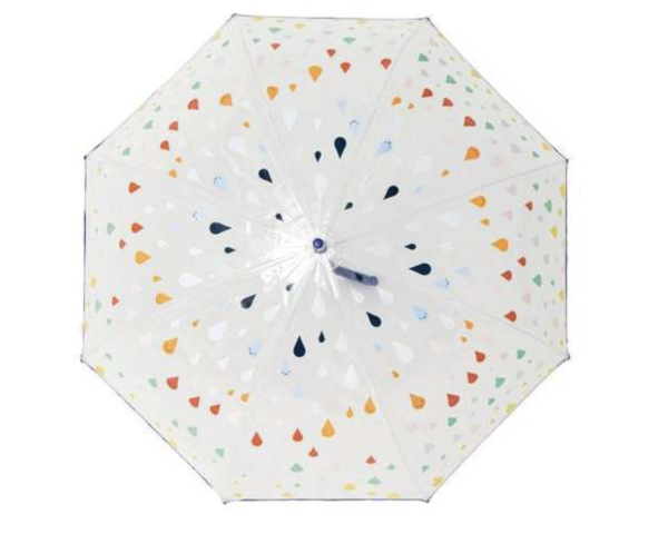 Découvrez le parapluie cloche gouttes transparent et magique de Little L, un magnifique parapluie illustré avec des gouttes en plastique transparent qui change de couleurs sous la pluie.
