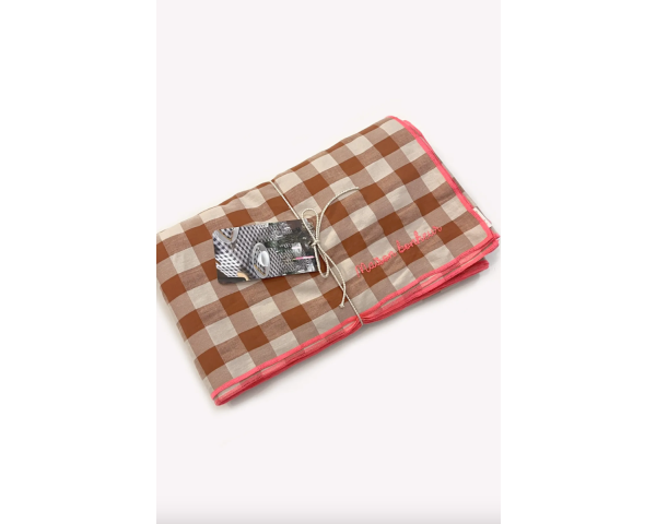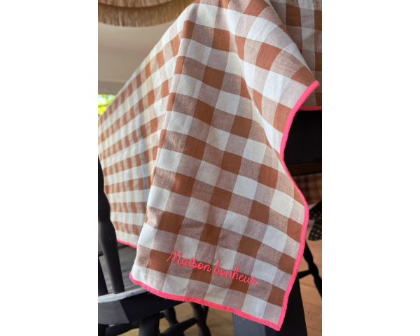 Apportez LA touche d'originalité Barnabé aime le café avec la nappe à carreaux en tissu coton vichy seersucker à l'aspect très légèrement gauffré. Son petit plus : le surjet contrasté qui la borde et la broderie "bon appétit" !