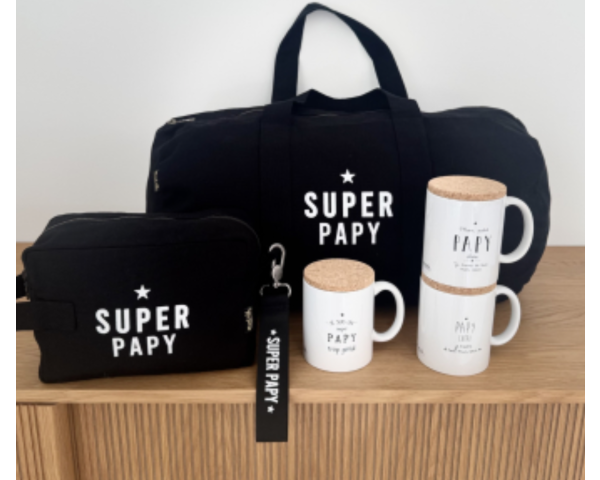 Adorable trousse de toilette à offrir à votre Super papy, confectionnée avec une jolie toile de coton noire certifiée OEKO-TEX® entièrement doublée avec sa dragonne pour la transporter partout.