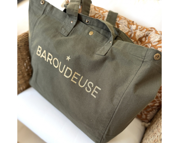 Grand sac cabas 100 % coton OEKO TEX légèrement délavé pour un look hyper stylé et décontracté, coloris vert forêt avec son imprimé pailleté or "Baroudeuse".