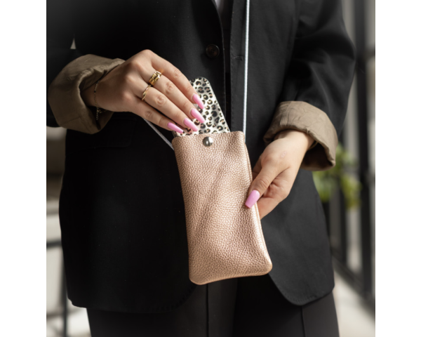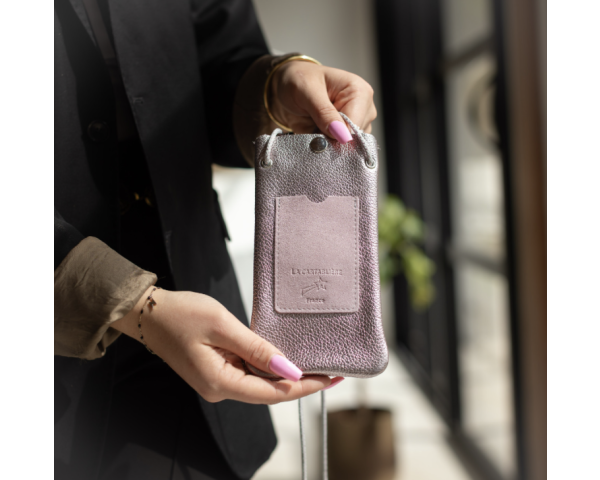 Vous cherchez une pochette de téléphone résolument féminine et élégante ? Ne cherchez plus, La cartablière a concocté pour vous une pochette en cuir pailleté pour y glisser votre téléphone ! Elle se portera en bandoulière, ainsi, plus besoin de chercher votre téléphone au fond de votre sac, le voici à portée de main. Sur le verso de cette pochette, une petite poche en cuir grainé vous permettra de ranger votre carte bleue. De quoi rassembler le strict minimum en un seul accessoire absolument fantaisie !