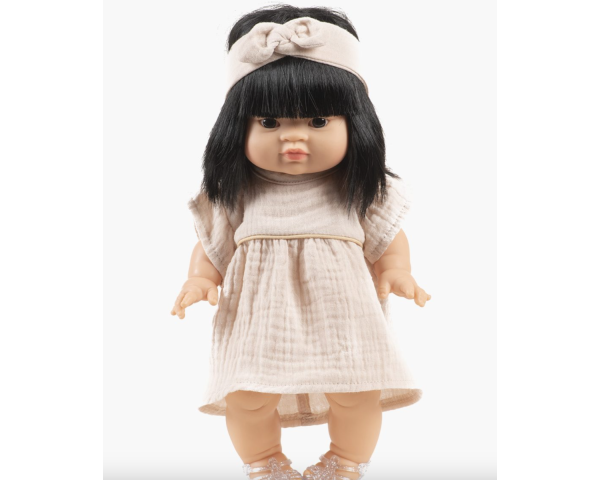 Robe Daisy et son headband à noeud rond en gaze de coton pour poupées Minikane Gordis 34 & 37cm.