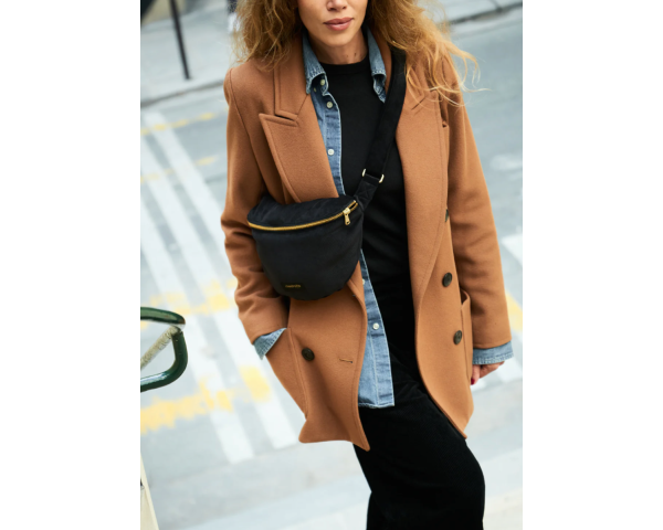 Ultra pratique, Custine est votre sac banane préféré depuis 2017. Sa anse ajustable vous permet de la porter sur un tshirt ou sur un manteau plus épais. Son compartiment arrondi accueille tous les dispensables d’une journée bien rangée. Custine se décline cette année dans un velours upcyclé aux fines côtes, souple et ultra doux. Elle se ferme par un zip YKK® doré. Sa doublure est upcyclée et noire. Elle est siglée d'une étiquette en nylon upcyclé.