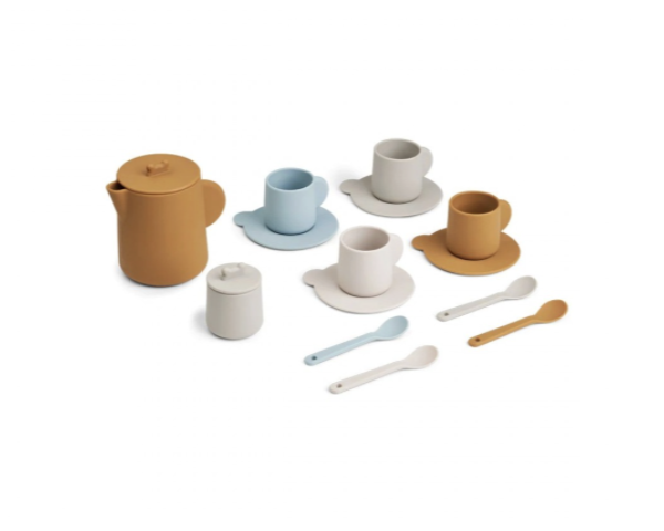 Le set de dinette / de thé en silicone comprend 4 tasses, 4 assiettes, 4 cuillères, 1 théière et 1 sucrier.