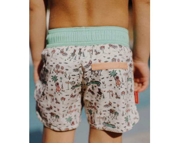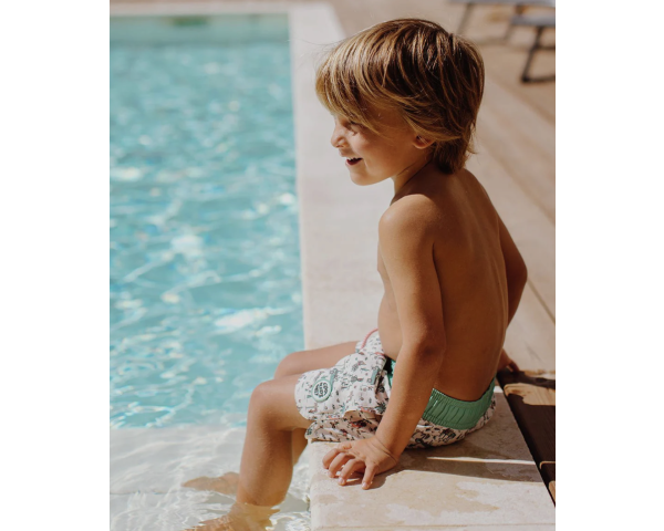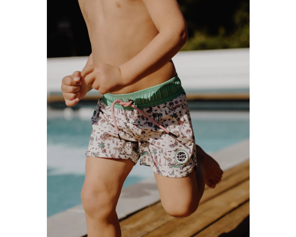 Laissez-vous tenter par le short de bain, Jungly. Maillot résistant, confortable et anti-UV. Le top ! Trois tailles, pour les kids de 3 à 8 ans.