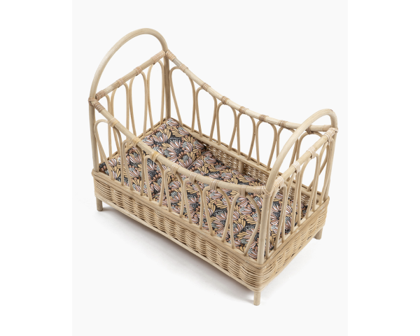 Lit "Jambi" et sa garniture en coton exclusif "Fleurs d'eau fond noir", de la Collection « JAKARTA », en bambou & rotin, pour poupée.