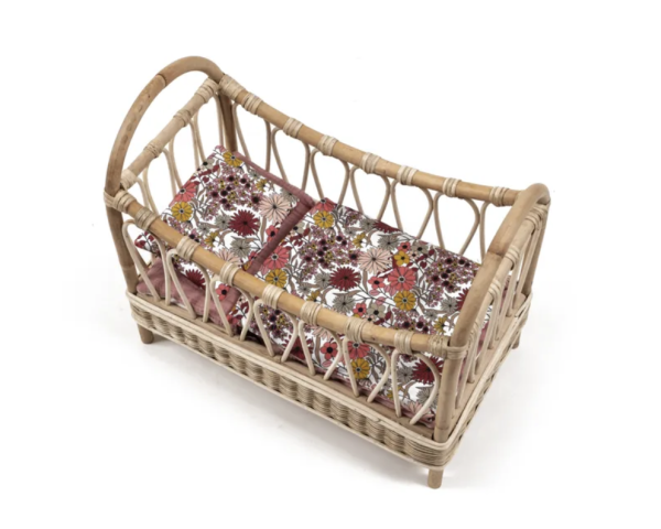 Lit "Jambi" en rotin pour poupée MINIKANE, vendu avec sa parure à l'imprimé "Flora" (couverture double et oreiller).