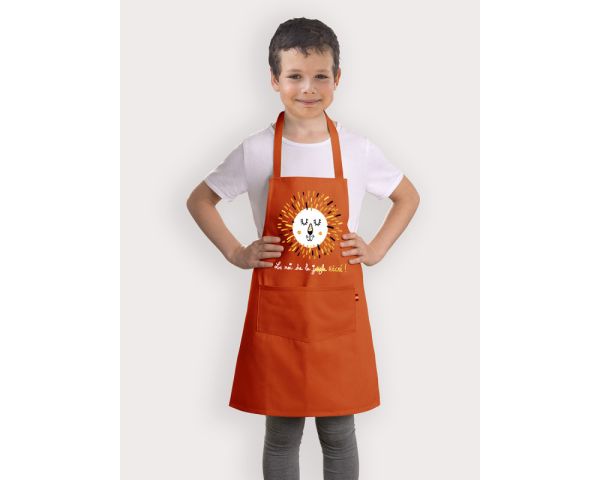 Découvrez le tablier enfant "Le roi de la récré", illustré par Sylvie Goutte Fougeas, sur un fond orange, en 100% coton et fabriqué en France dans l'atelier de la marque Alma Mater.