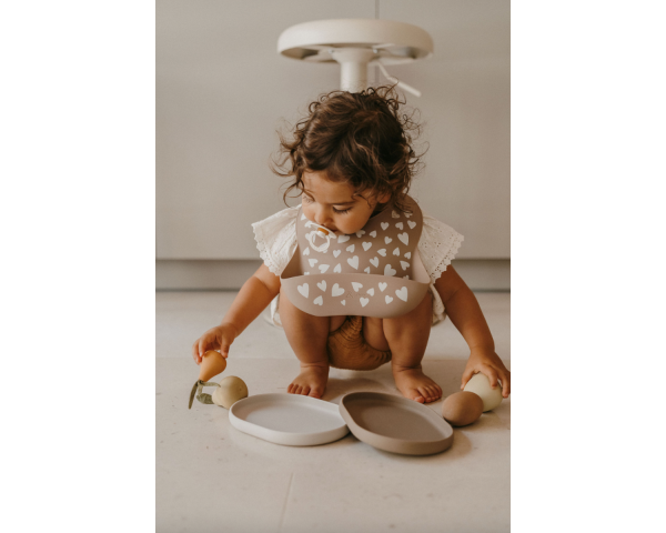 Pour garder les vêtements de votre bébé propres durant ses repas, notre joli bavoir “Fall in love” à la teinte taupe rosé est idéal.