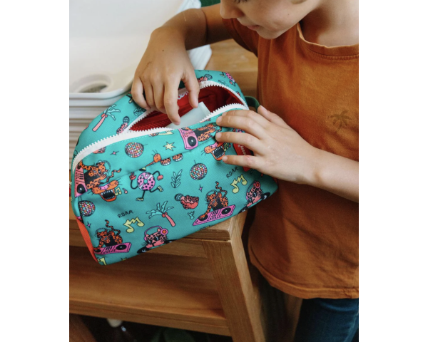 Craquez pour la Trousse de toilette Disco Roar avec son imprimé, créatif, ludique et coloré. Cette trousse va suivre les kids partout.