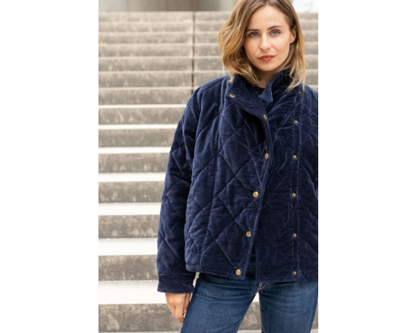 La veste Kapur en velours lisse matelassé se distingue par sa coupe croisée élégante et son col haut, pour une silhouette structurée et moderne. Doublée pour plus de chaleur, elle offre confort et style. Ses poches passepoilées et ses poignets ajustables à pressions en font une pièce aussi pratique que raffinée, idéale pour la saison.